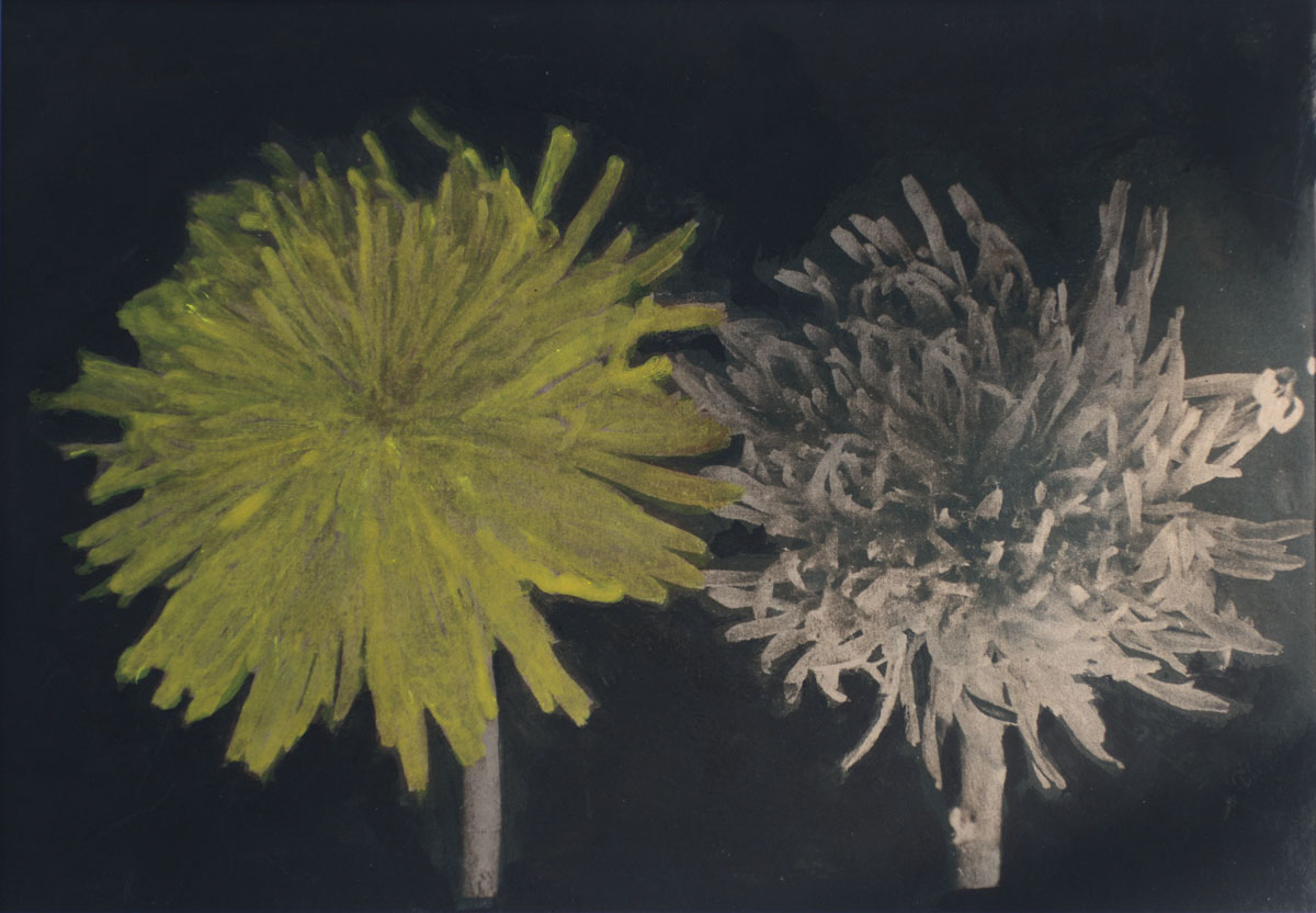 DIN A4, sepiafarbene Cyanotypie auf Papier, nachcoloriert, gerahmt, fluoreszierend